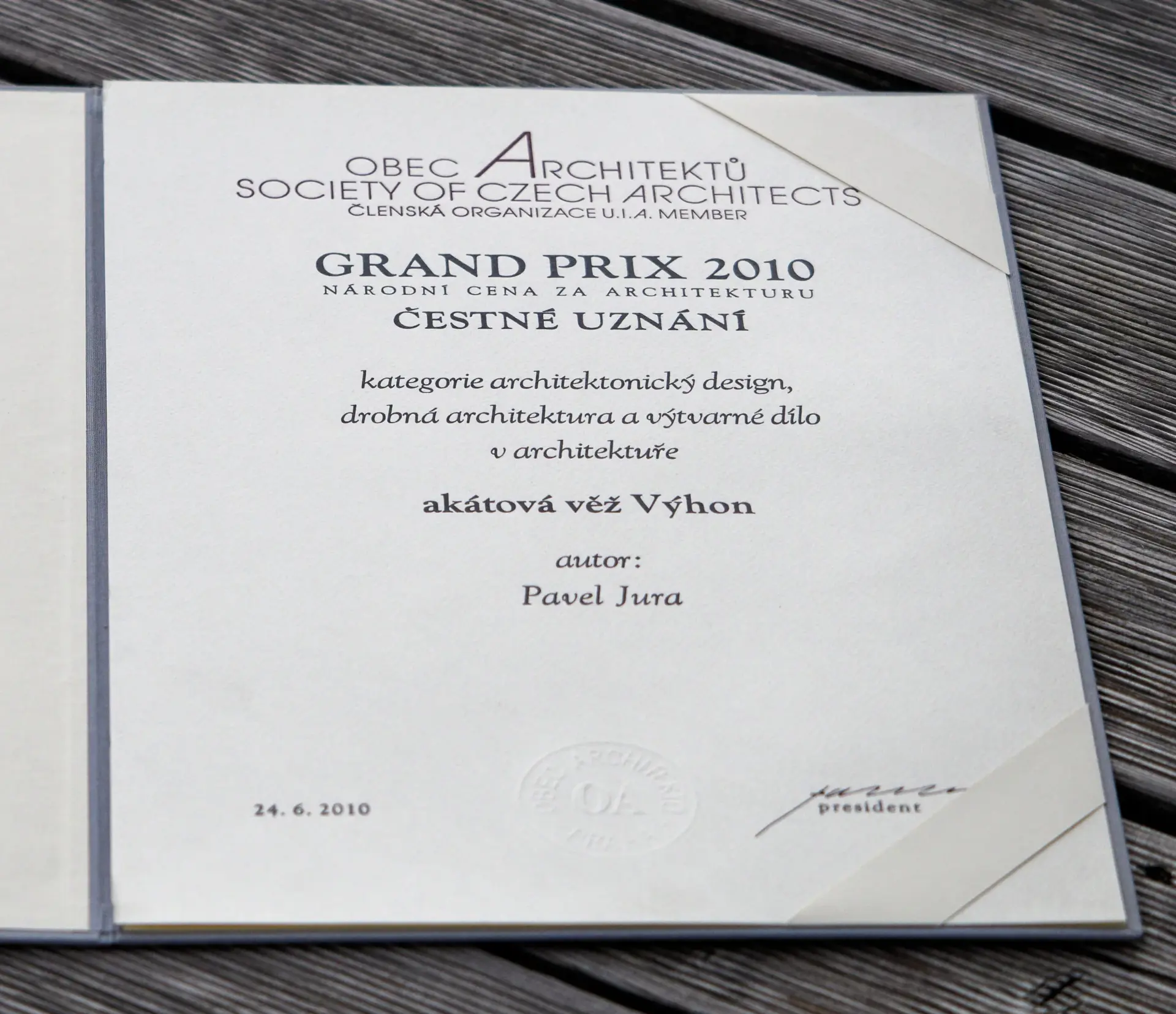 Obec architektů každoročně vyhlašuje Grand Prix Architektů – Národní cenu za architekturu – největší českou architektonickou soutěž o nejlepší realizaci. Soutěž byla založena Prof. Ing. Akad. Arch. Alenou Šrámkovou roku 1993. V roce 2010 byla stavba Akátové věže oceněna čestným uznáním v kategorii architektonický design, drobná architektura a výtvarné dílo v architektuře.